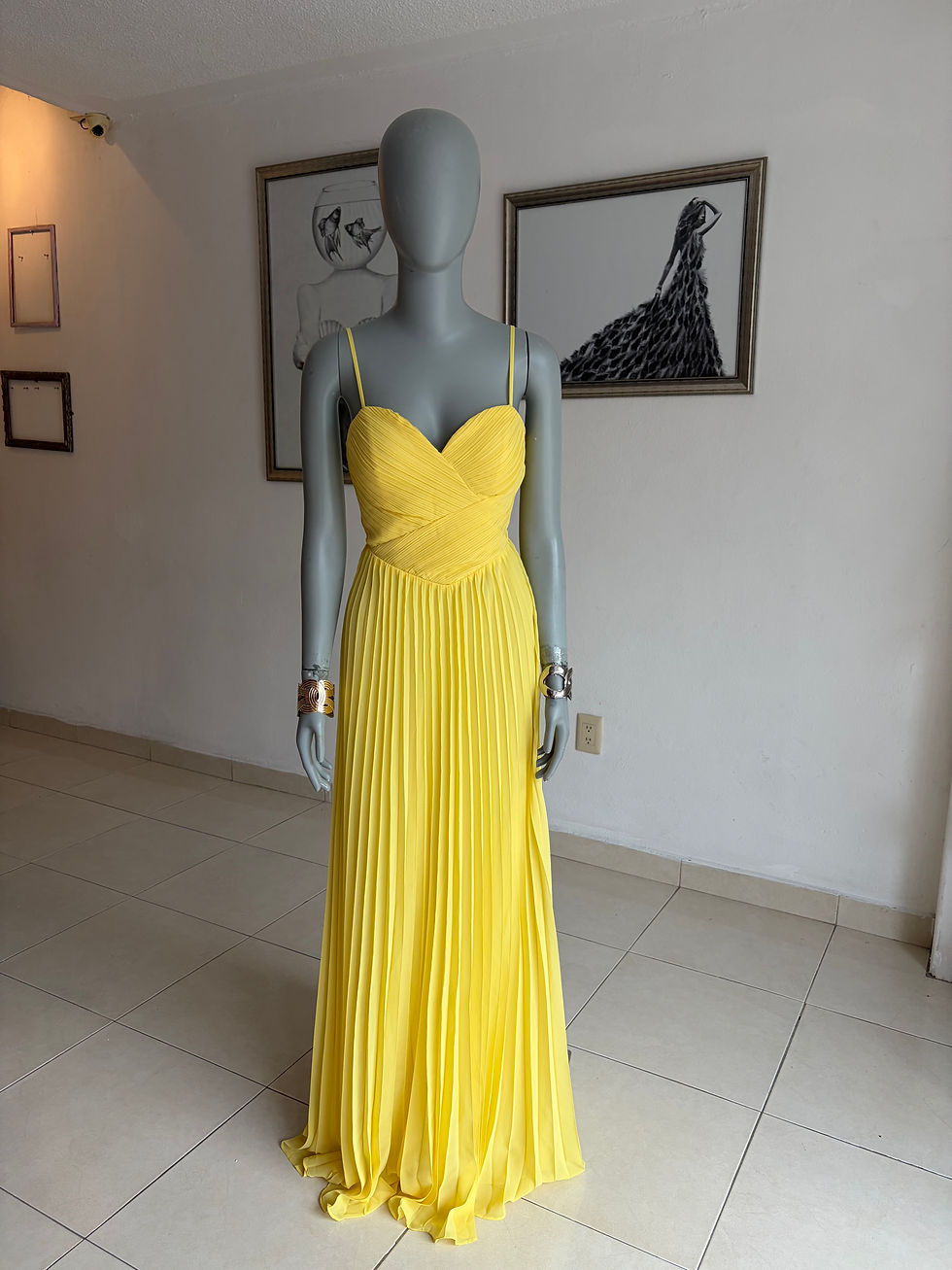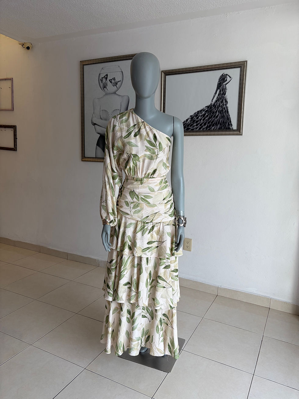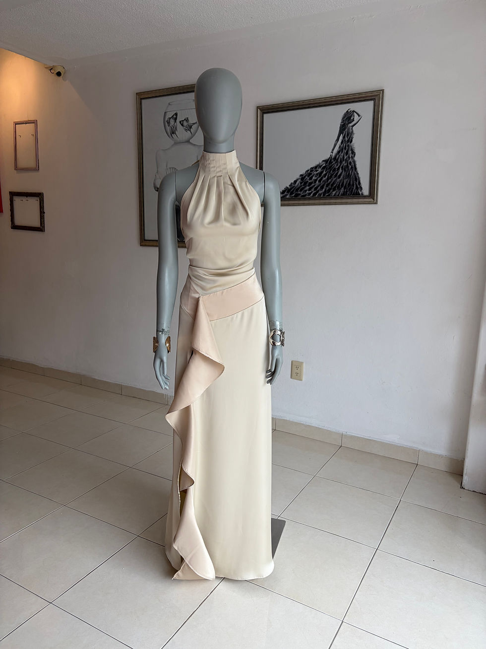M317 Beige cuello halter, abertura en la pierna, corset ajustable en la espalda