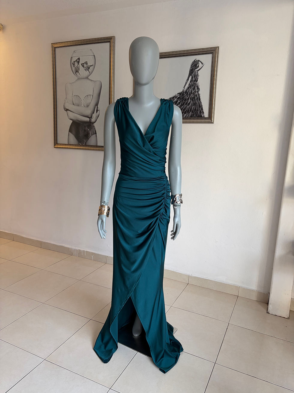 B039 azul petróleo drapeado de la falda con abertura en pierna